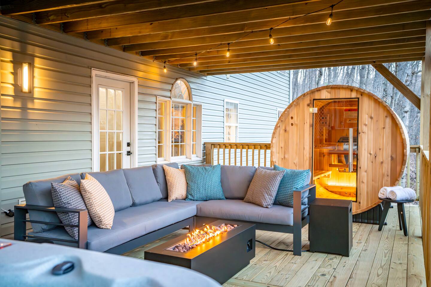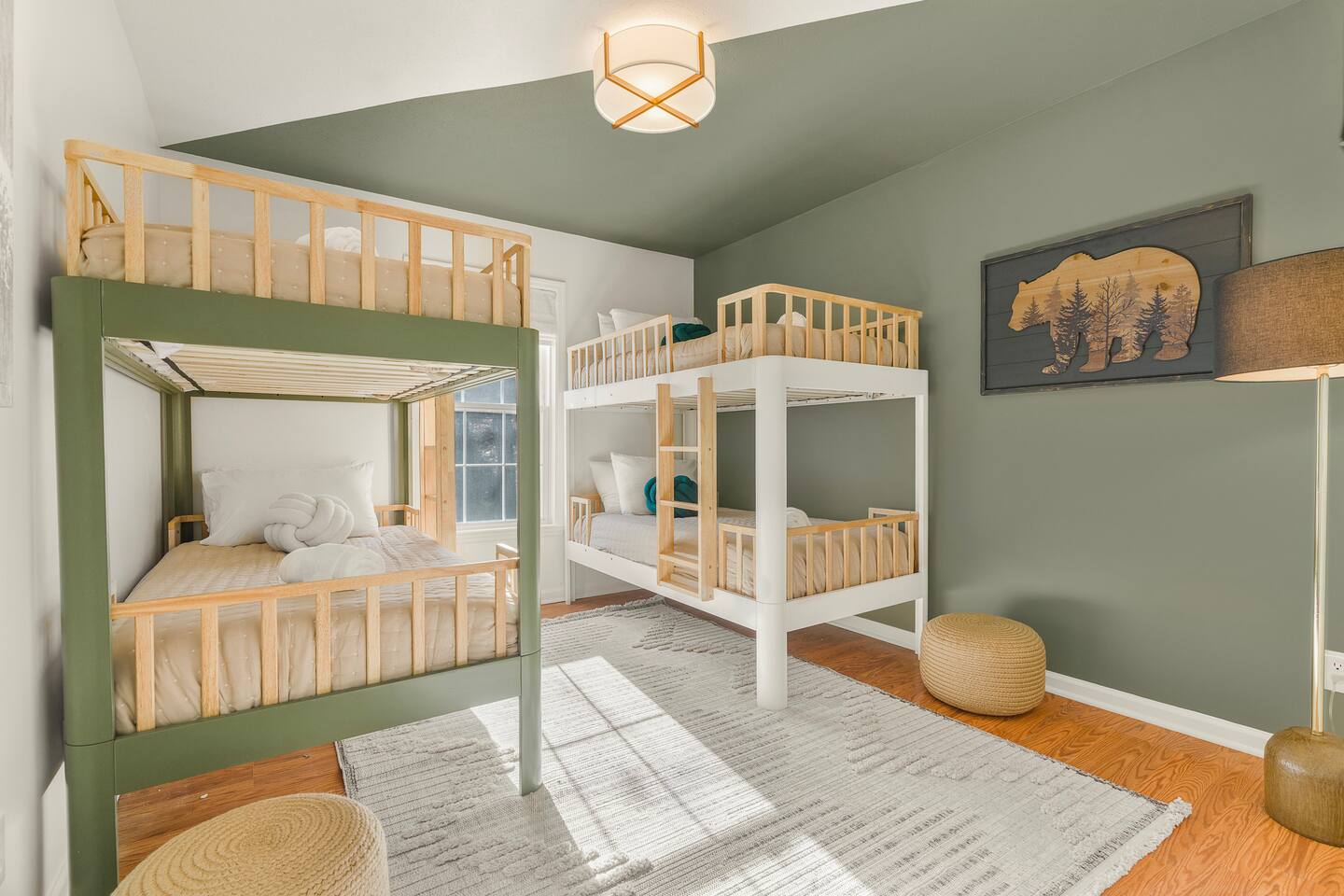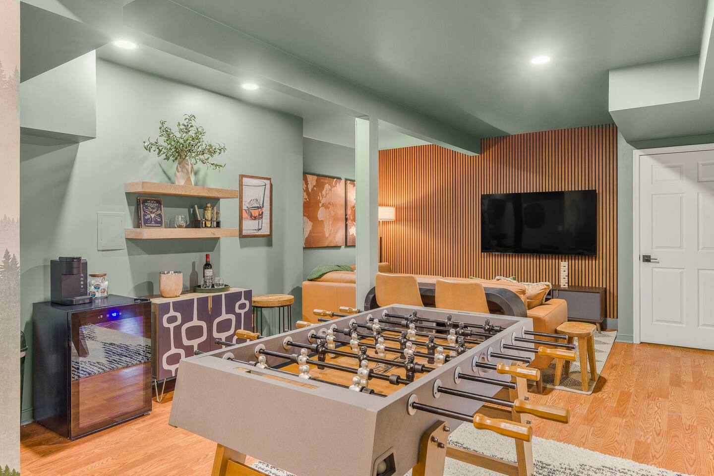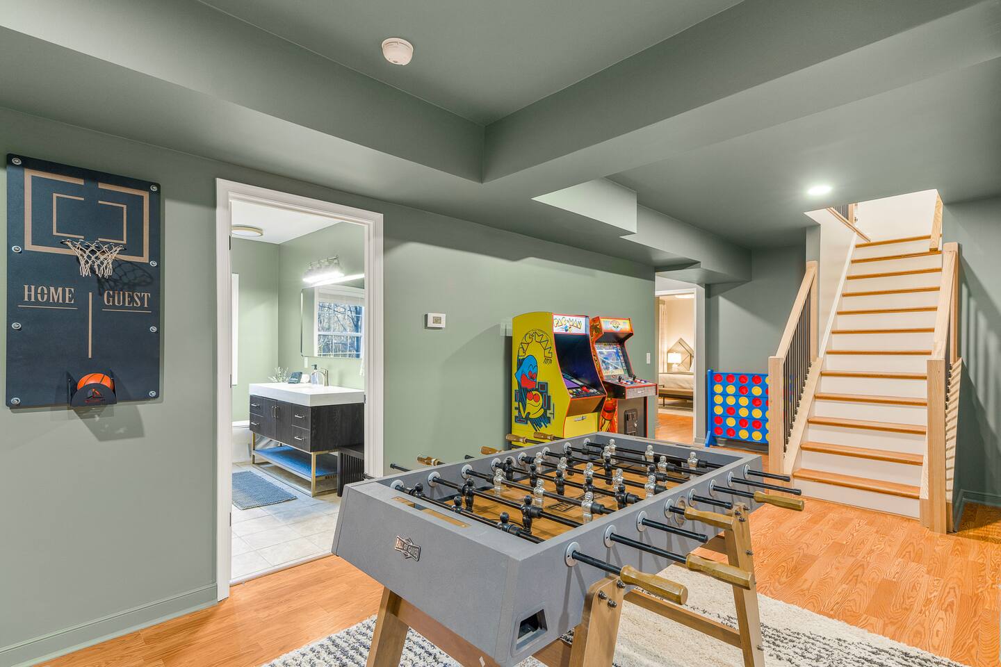 The home layout is as follows: Main level: - Private back deck with brand new dining table for 16 and lounge area with propane firepit and gas grill (propane provided for both) - Living room with large TV and electric fireplace, open to dining area and kitchen - Dining table seats 11, plus 5 more at the bar - Kitchen has stainless appliances and is fully stocked with everything needed to prepare meals. Ground coffee and k-cups provided. - BR1: Master bedroom with king bed and ensuite bathroom with shower/tub combo - BR2: King bedroom - BR3: Two sets of twin-over-twin bunk beds - Hallway full bath with shower/tub combo - Garage (also holds add'l full size refrigerator, full size washer and dryer, and a set of cornhole boards) Lower level: - Lower deck features brand new hot tub, barrel sauna, and couch with additional propane fire table - Additional living room with leather couch, 65" TV, foosball, 2 arcade machines, karaoke machine, large connect 4, and wet bar with mini fridge - BR4: King bedroom with ensuite bathroom with soaker tub and separate shower - BR5: King bedroom - BR6: Queen-over-queen bunk bed - Hallway full bath with shower Things to do nearby: The house is about a 7 minute drive to the slopes, pool, and dining at Massanutten, 4 minutes to the spa, and just 5 minutes to the indoor/outdoor Waterpark. The Swift Run Gap entrance to Shenandoah National Park is 15 minutes away with some of the best hiking on the east coast. JMU and everything else in Harrisonburg is 20 minutes away, and there are several breweries, wineries, and restaurants within 20 minutes of the house.