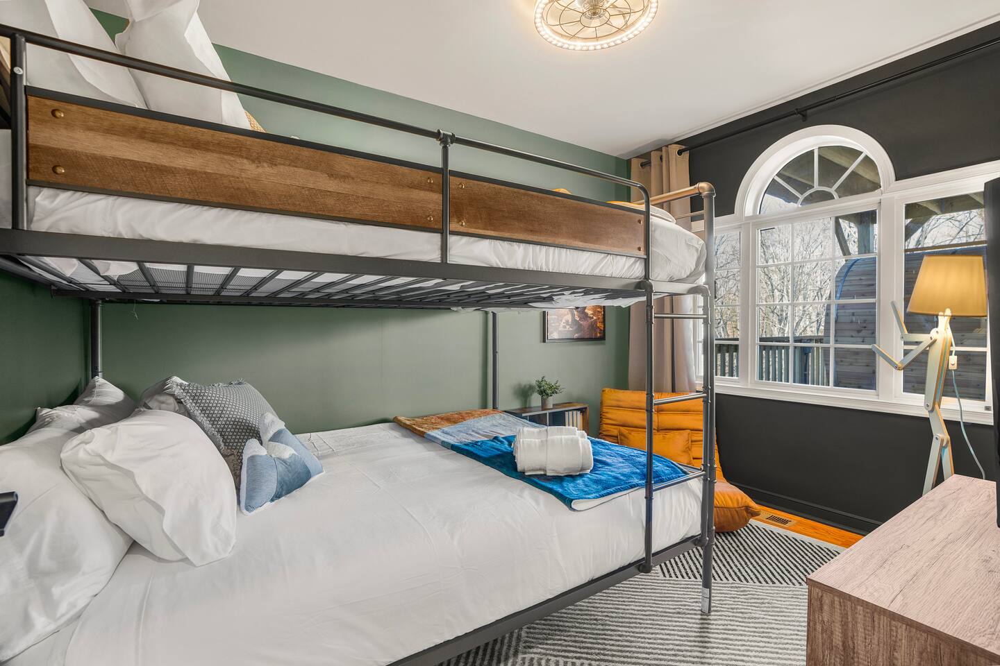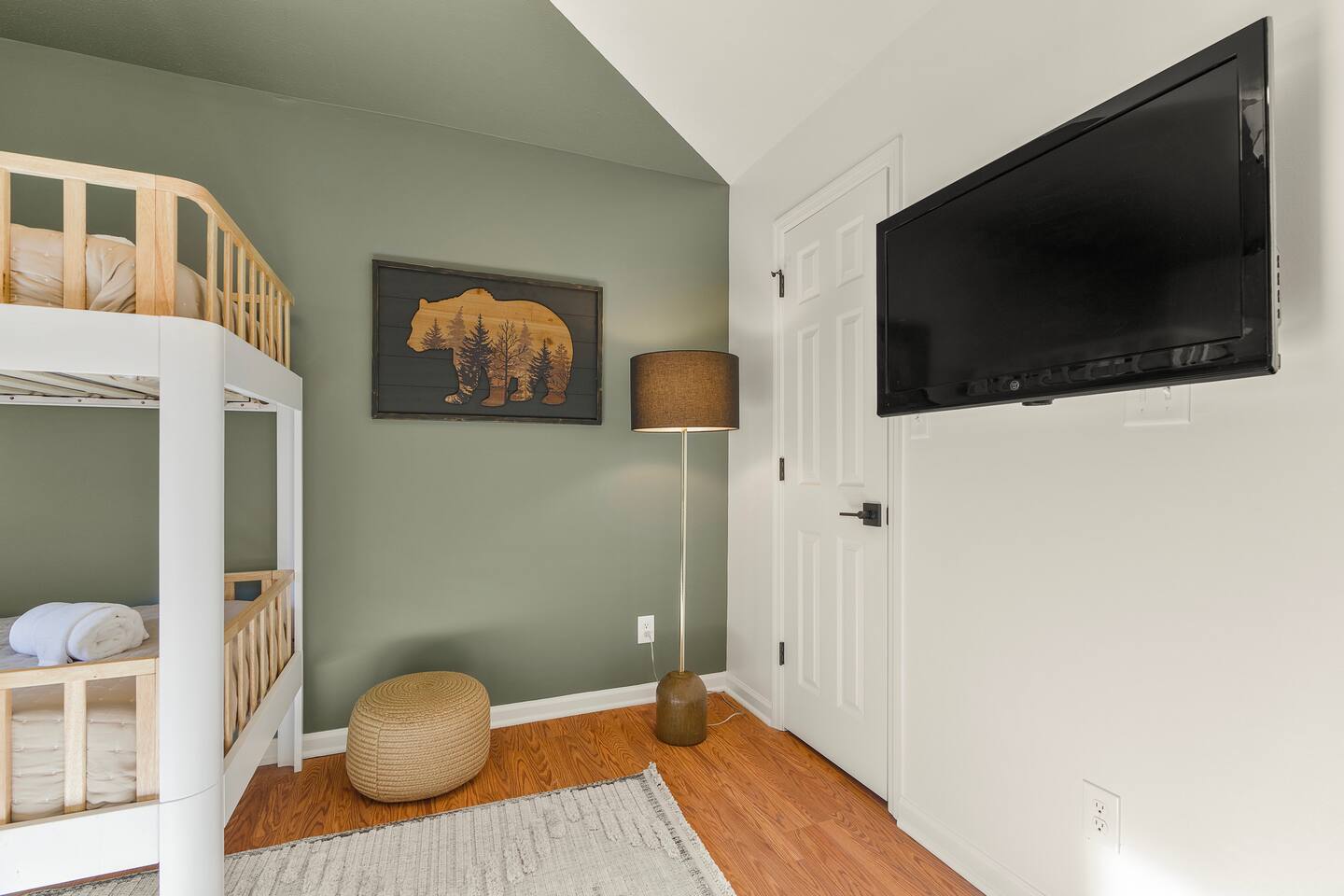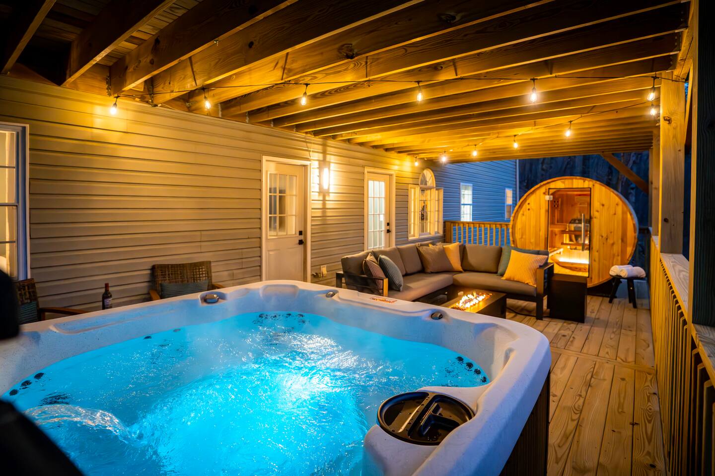 The home layout is as follows: Main level: - Private back deck with brand new dining table for 16 and lounge area with propane firepit and gas grill (propane provided for both) - Living room with large TV and electric fireplace, open to dining area and kitchen - Dining table seats 11, plus 5 more at the bar - Kitchen has stainless appliances and is fully stocked with everything needed to prepare meals. Ground coffee and k-cups provided. - BR1: Master bedroom with king bed and ensuite bathroom with shower/tub combo - BR2: King bedroom - BR3: Two sets of twin-over-twin bunk beds - Hallway full bath with shower/tub combo - Garage (also holds add'l full size refrigerator, full size washer and dryer, and a set of cornhole boards) Lower level: - Lower deck features brand new hot tub, barrel sauna, and couch with additional propane fire table - Additional living room with leather couch, 65" TV, foosball, 2 arcade machines, karaoke machine, large connect 4, and wet bar with mini fridge - BR4: King bedroom with ensuite bathroom with soaker tub and separate shower - BR5: King bedroom - BR6: Queen-over-queen bunk bed - Hallway full bath with shower Things to do nearby: The house is about a 7 minute drive to the slopes, pool, and dining at Massanutten, 4 minutes to the spa, and just 5 minutes to the indoor/outdoor Waterpark. The Swift Run Gap entrance to Shenandoah National Park is 15 minutes away with some of the best hiking on the east coast. JMU and everything else in Harrisonburg is 20 minutes away, and there are several breweries, wineries, and restaurants within 20 minutes of the house.