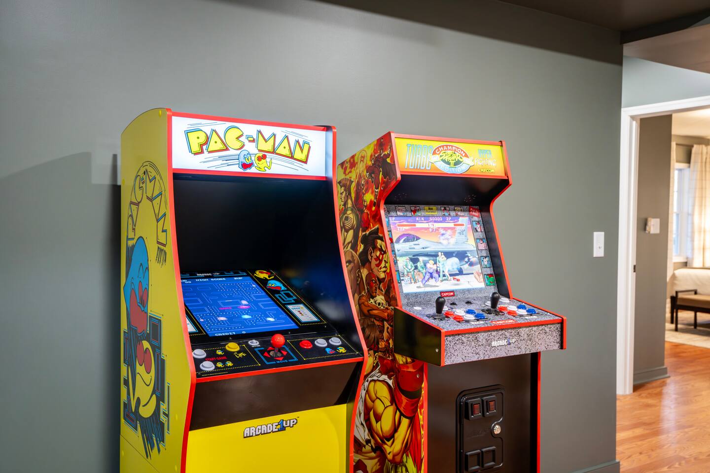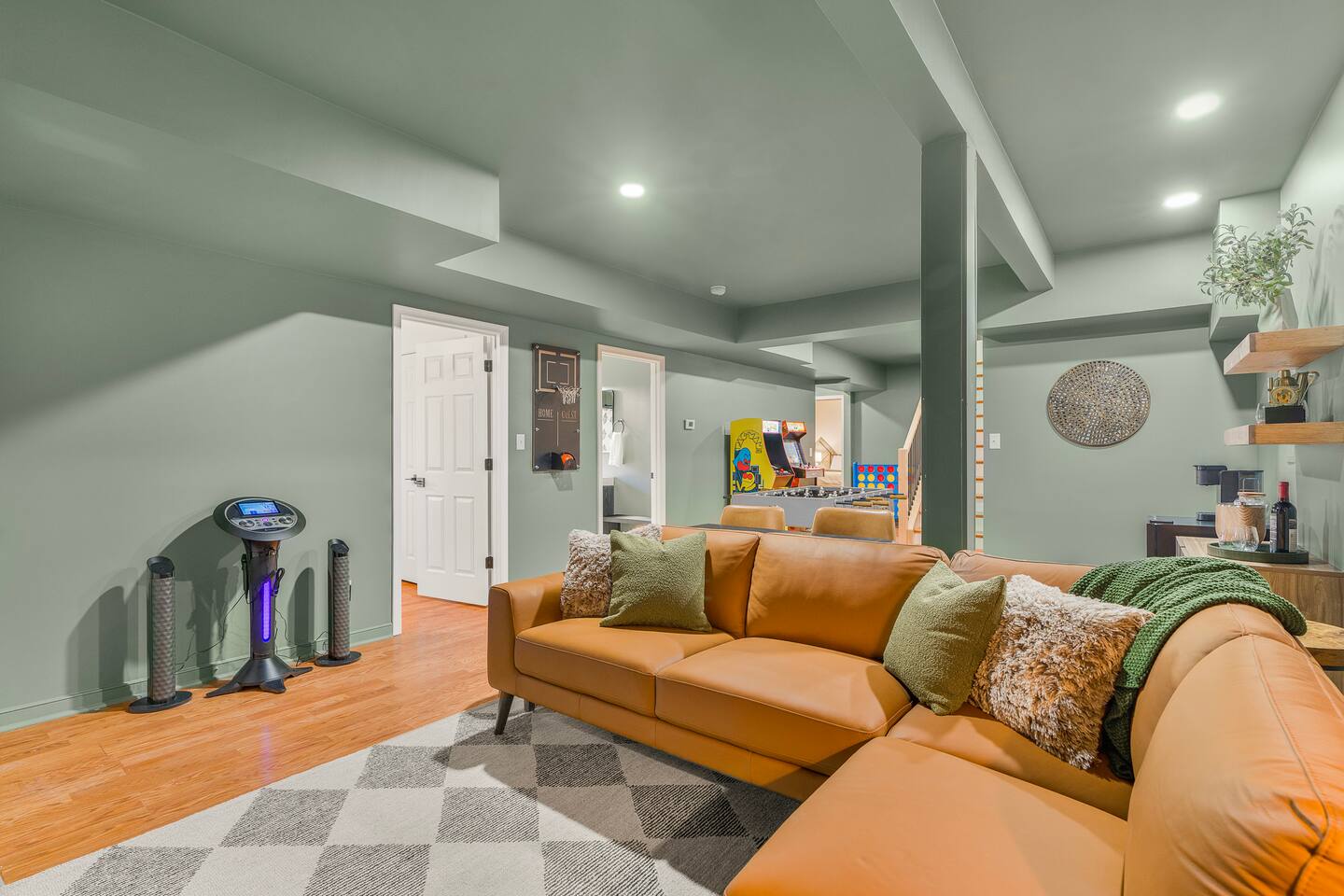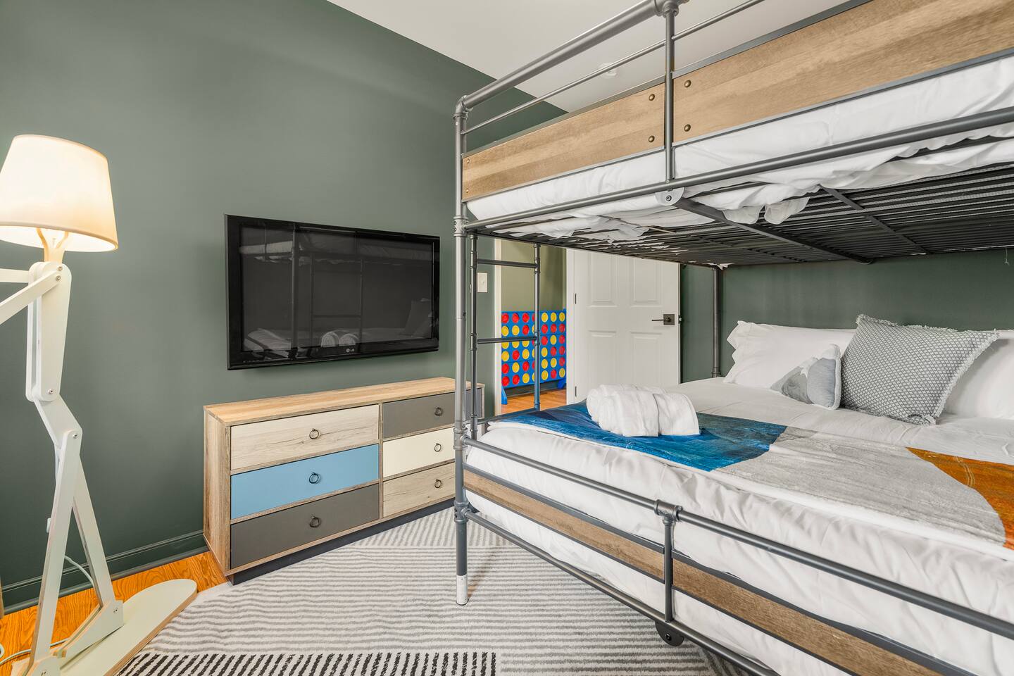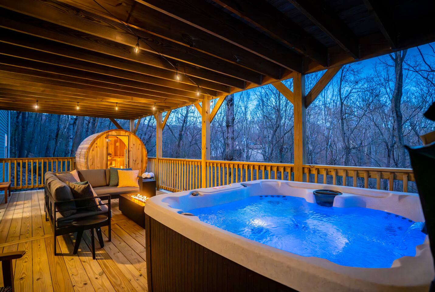 The home layout is as follows: Main level: - Private back deck with brand new dining table for 16 and lounge area with propane firepit and gas grill (propane provided for both) - Living room with large TV and electric fireplace, open to dining area and kitchen - Dining table seats 11, plus 5 more at the bar - Kitchen has stainless appliances and is fully stocked with everything needed to prepare meals. Ground coffee and k-cups provided. - BR1: Master bedroom with king bed and ensuite bathroom with shower/tub combo - BR2: King bedroom - BR3: Two sets of twin-over-twin bunk beds - Hallway full bath with shower/tub combo - Garage (also holds add'l full size refrigerator, full size washer and dryer, and a set of cornhole boards) Lower level: - Lower deck features brand new hot tub, barrel sauna, and couch with additional propane fire table - Additional living room with leather couch, 65" TV, foosball, 2 arcade machines, karaoke machine, large connect 4, and wet bar with mini fridge - BR4: King bedroom with ensuite bathroom with soaker tub and separate shower - BR5: King bedroom - BR6: Queen-over-queen bunk bed - Hallway full bath with shower Things to do nearby: The house is about a 7 minute drive to the slopes, pool, and dining at Massanutten, 4 minutes to the spa, and just 5 minutes to the indoor/outdoor Waterpark. The Swift Run Gap entrance to Shenandoah National Park is 15 minutes away with some of the best hiking on the east coast. JMU and everything else in Harrisonburg is 20 minutes away, and there are several breweries, wineries, and restaurants within 20 minutes of the house.